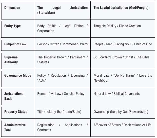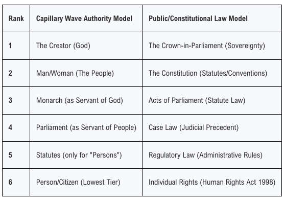 The ideological framework of the Capillary Wave rests upon a binary view of governance, which Edwards terms "The Paradigm". According to this worldview, every individual exists in one of two positions: either as a "people under God" in the highest possible standing on earth, or as a "citizen" or "electorate" in the lowest possible position within a country. 1 This bifurcation is not merely a moral or spiritual distinction but is presented as a functional jurisdictional reality that governs every interaction between the individual and Edwards argues that the "United Kingdom" is not a tangible reality but a "body politic"—a legal fiction or corporate entity that exists only in the minds of those who believe in it. Conversely, he asserts that "Britain" is the physical landmass created by divine authority, and the "people" who reside upon it are subject only to "God’s Law" as found in the Authorized King James Version (KJV) 1611 Bible.