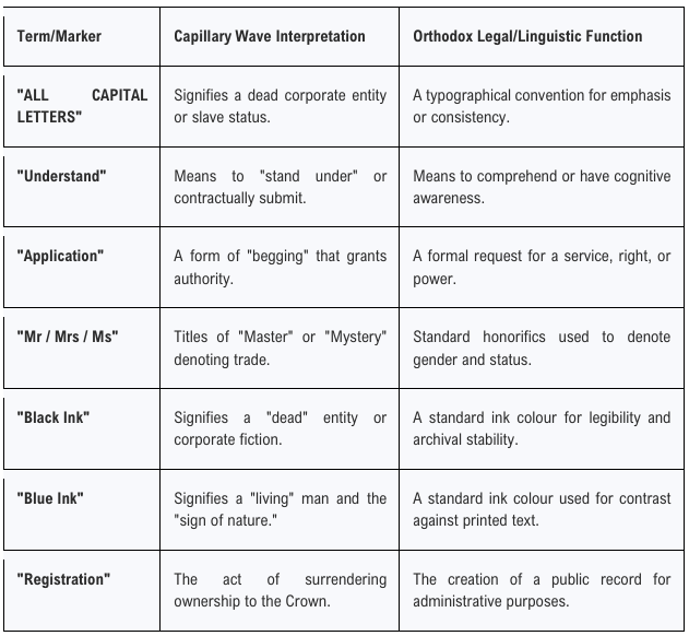 At the heart of the Capillary Wave’s critique of the state is the "Strawman" theory, which posits that the administrative state operates through the creation of a "legal fiction" known as the "person". Edwards argues that the state distinguishes between the "living man" or "living woman" and the "statutory person" through linguistic and typographical markers. A primary claim is that the use of all-capital letters for a name on a birth certificate, driver’s license, or court summons signifies a "body corporate" or a "dead entity" (CAPITIS DIMINUTIO MAXIMA), which is legally distinct from the flesh-and-blood human being.