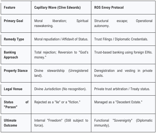 3. Financial and Operational Impotence: The Capillary Wave suggests that individuals should simply "reject system banks" and view debt as "spiritual bondage". ROS critics argue that this provides no "worldly remedy" for financial strife. In contrast, the ROS model proposes "trust-based banking," "administrative recoupment," and the use of "foreign EINs" to create a parallel financial jurisdiction.