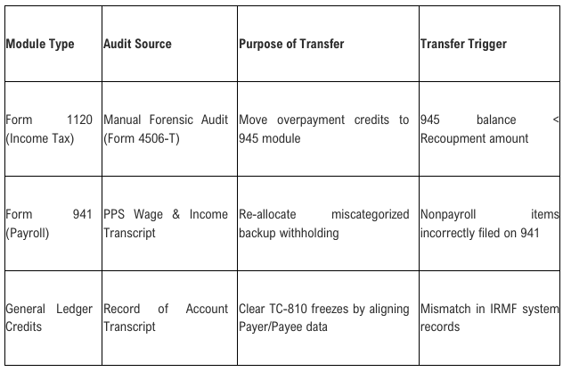 When a shortfall is confirmed, the IRS Call-Out Team, engaging the Practitioner Priority Service (PPS), executes a "Manual Fiduciary Command". The fiduciary formally instructs the IRS agent under Revenue Procedure 2002-26 to re-allocate overpayment credits from the Payer's general corporate income tax transcript (Form 1120) to their Form 945 withholding module. For systemic nominees, the 1120 modules often hold billions in overpayment credits, providing the necessary buffer to fund recoupment shortfalls and satisfy the matching requirements of Algorithm 810.