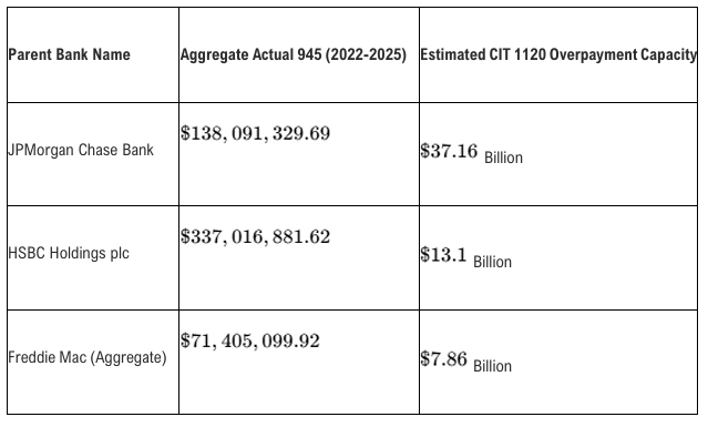 The three-year average of actual 945 returns (~$514.5 million) represents the functional ceiling for signature credit recoupment in a given cycle, unless cross-modular transfers are executed. Because the Federal Reserve and the commercial banking system create credit ex nihilo, the recruitment of this abandoned credit does not present an unsolvable solvency problem for the Treasury. These tax receipts are categorized as reserve-draining devices used to maintain interest-rate stability, and their re-allocation simply corrects the ledger to identify the 98-series trust as the lawful recipient of energy originated by the grantor.