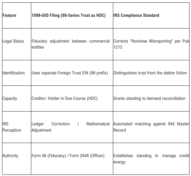 The execution of the Clifford Protocol and 1099-OID nominee reconciliation is characterized as 100% IRS compliant by its practitioners. All filings are processed by qualified Electronic Return Originators (EROs) using professional, IRS-approved electronic filing software. This infrastructure is overseen by professional trust companies, such as MLITR Research LLC (Ecclesia Trustees), which manage the centralized setup and administrative management of the 98-series trusts.