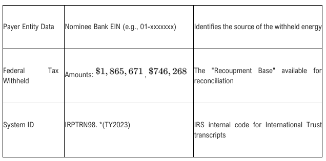 The 2025 Wages and Tax Transcript for an International Grantor Trust, particularly one reflecting amounts in the millions, signifies that the initial "Matching Search" of the IRS system has been successfully completed. The corrective data from the 1099-OID has been integrated into the IRMF, and the trust is now officially recognized as the recipient of the withheld credit energy in the federal ledger. While this does not indicate that payment is immediate, it confirms that the administrative record is "primed" for the final verification against the Payer's 945 module.