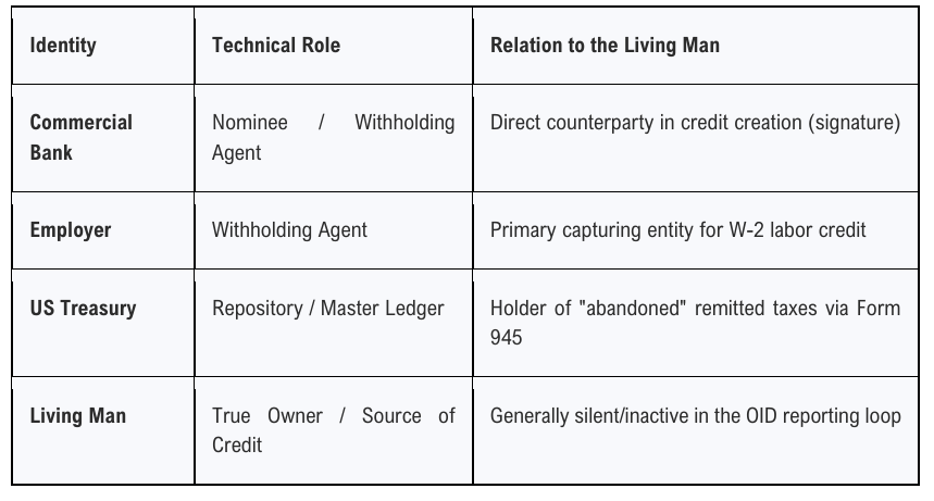4. Verification (810 Code Algorithm): The IRS verifies that the nominee's (bank's) Form 945 master record contains enough "negative numbers" (credits) to satisfy the Trust's claim. If the math matches the bank's own remitted taxes, the credit is moved from the nominee's public ledger to the Trust's private ledger.