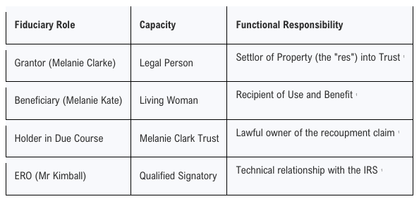 The Plaintiff Trust asserts its status as the Holder in Due Course (HDC) through corrected IRS 1212 filings, a process facilitated by Mr Kimball, a qualified Electronic Return Originator (ERO). The trust holds the "res," which encompasses the property and all associated rights and negotiable instruments created by the grantor's signature. Consequently, any redemption offer made by the trust constitutes a discharge from Melanie's "own resources," satisfying the standard mortgage conditions that require repayment from the borrower’s capital rather than third-party funding. The administrative architecture of this capacity alignment is detailed in the following fiduciary role distribution: