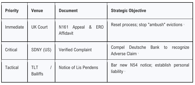 The immediate tactical priority in the United Kingdom is the appeal against the order of District Judge Whitehouse dated January 14, 2026, which improperly dispensed with the mandatory 14-day notice of eviction under Civil Procedure Rule (CPR) 83.8A. The failure of the bank and the court to adhere to this statutory requirement represents a "serious procedural irregularity".