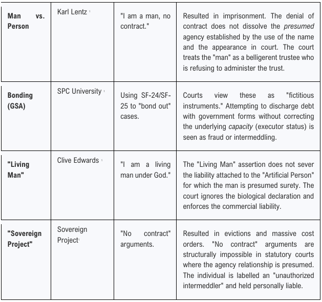 The primary failure of "Freemen on the Land," "Sovereign," and similar groups is a fundamental category error regarding jurisdiction. They attempt to argue facts (biological reality, moral truth, common law rights) in a court of form (commercial agency, statutory contract, admiralty/equity).
