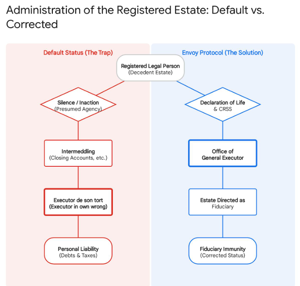 Once agency is severed, the "abandoned" estate must still be administered (or the Crown will resume doing so). The Envoy Protocol asserts that the living man must occupy the Office of General Executor for the registered decedent estate.
