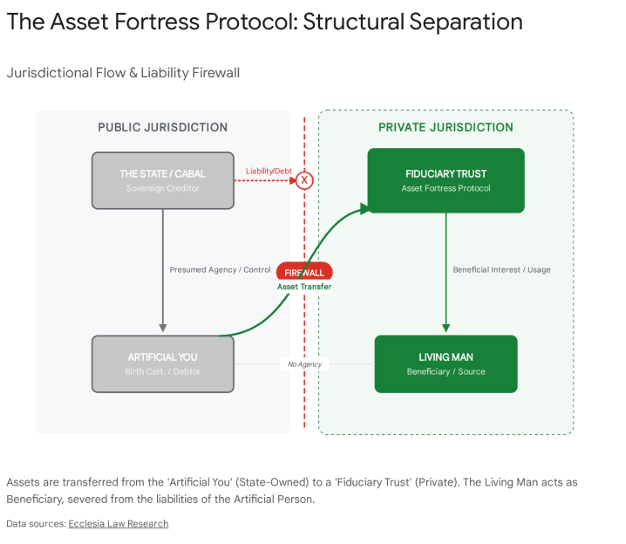 The visual above illustrates this structural separation. By moving assets across the jurisdictional barrier into the Fiduciary Trust, they are shielded from the liabilities that accrue to the Artificial Person in the Public Jurisdiction.