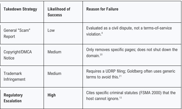 3. Namecheap UK Legal Notice: Send a formal "Notice and Takedown" to legalandabuse@namecheap.com. This notice should not be a general abuse report. It must be a legal letter citing the FSMA 2000 violations and Goldberg’s own sworn confession of unauthorized activity.12 State that the continuation of hosting services for a known criminal enterprise involved in unauthorized financial services creates liability for Namecheap under the Proceeds of Crime Act (POCA) 2002.